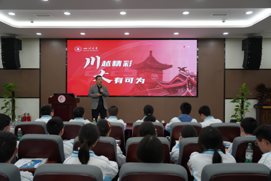 四川大学招生办公室副主任廖爱民对盐道街中学和树德实验高级中学的师生们表示热烈欢迎。他从川大悠久的办学历史、强大的学科实力、特色优势专业、创新培养模式以及优美学习环境等方面,全方位展示了在川大学习生活的精彩画卷。廖主任还详细解读了招生政策与专业设置,着重介绍了川大创新培养机制,鼓励学生深入了解川大,踊跃报考。