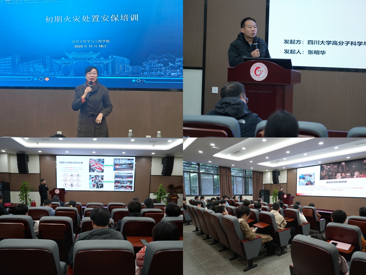 本次活动采用“理论培训与实战演练”相结合的模式,旨在全面提升师生安全素养。理论培训环节在科教楼209会议室举行,实验室安全责任人及各课题组学生安全负责人参加了集中学习。培训特邀成都莱博睿安科技服务有限公司罗王春工程师,就实验室化学品与耗材的规范清理及风险管控进行了专业讲解。张明华老师聚焦实验室初期火灾应对,并结合既往安全检查实例,深入阐释了“先报警、后处置、快疏散”的应急处置原则,强化了“预防为先、处置在后”的安全理念。李艳梅副院长在培训总结中再次强调了安全工作的极端重要性,并结合学院即将入驻先进材料大楼的规划,要求各课题组提前做好实验室物品与设备的统筹整理工作,将安全管理的细节落到实处。