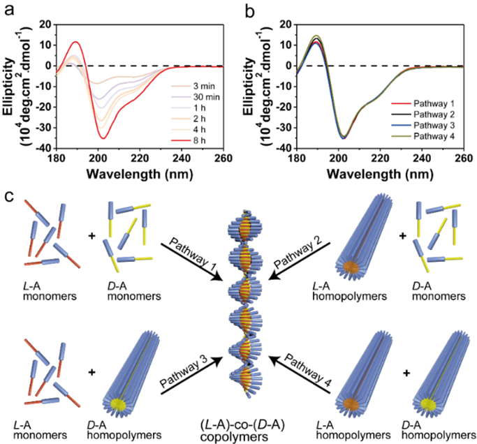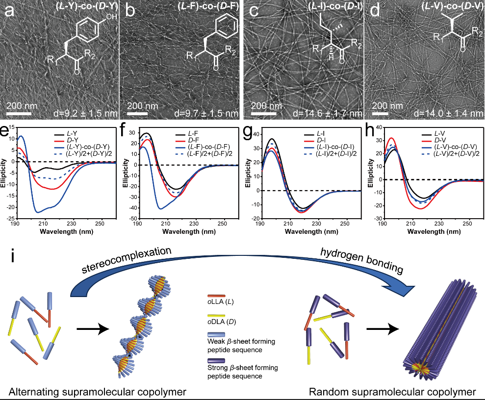 超分子交替共聚物是双组分共聚物的特殊形式,需要两种单体之间存在强烈的异源相互作用。学院苏浩特聘研究员课题组首次利用寡聚乳酸(oLA)对映异构体之间的立构复合作用(Stereocomplexation),开发了一种基于多肽-寡聚乳酸偶联物的超分子交替共聚物体系。具体来说,研究团队以oLLA和oDLA作为手性疏水尾链,并选择较弱β-sheet倾向的多肽片段制备了两种多肽-寡聚乳酸偶联物作为组装基元L-A和D-A(图1)。两种单体均能够自组装形成直纤维,其直径约14.8 nm,符合双分子层堆叠模型。而L-A/D-A共混物的组装形貌转变为螺旋纤维,其直径约9 nm,与交错双分子层模型高度吻合。研究团队通过圆二色(CD)、UV-vis、红外等光谱手段,以及临界胶束浓度(CMC)的测定系统表征了共混物的分子排列方式和组装能力等(图2)。手性疏水尾链之间的立构复合作用能显著增强共混物的组装能力,驱动两种单体交替排列,最终形成超分子交替共聚物。研究团队进一步探究了组装路径对自组装行为的影响(图3)。在四种不同组装路径下,共混物均最终形成螺旋纤维,且它们的CD光谱几乎完全一致,表明超分子交替共聚物即为热力学平衡态的组装产物。最后,研究团队通过改变多肽链段的β-sheet倾向,探究了手性疏水尾链之间的立构复合相互作用与多肽链段间氢键相互作用之间的竞争与协同机制。在弱氢键体系中,立构复合相互作用促进两种单体形成异源二聚体,进一步驱动两种单体交替排列形成螺旋纳米纤维。当多肽链段之间的氢键相互作用增强,共组装主要驱动力逐渐转变为氢键相互作用,两种单体随机排列,最终形成无规共聚物。该工作利用立构复合相互作用和氢键相互作用的竞争和协同成功制备了热力学稳定的超分子交替共聚物,为超分子交替共聚物的制备和超分子共聚物微观结构的控制提供了新方法和新策略。