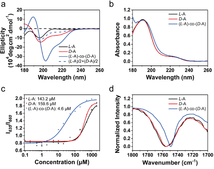 图2 光谱学表征。(a)圆二色(CD)光谱,(b)UV-vis吸收谱,(c)临界胶束浓度(CMC)曲线以及(d)傅里叶红外(FTIR)光谱
