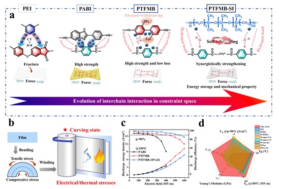 1.针对储能聚合物电介质薄膜的力学强度和储能性能难以协同提升的矛盾问题,通过“高取向/结晶结构”与“强氢键限域高能隙”协同作用,实现了杂环芳纶薄膜超高力学强度(378.3MPa)、高温(150℃)高击穿强度(682kV/mm)、高温(150℃)高储能密度/效率(6.06J/cm3/η=90%,峰值放电能量密度为10.29J/cm3);上述性能相对于相应的聚酰亚胺薄膜实现了协同提升(81%, 88%, 2231%)(Nature Communication, 2025, 16, 10.1038/s41467-025-64961-3)。论文第一作者为四川大学电气工程学院/先进高分子材料全国重点实验室樊坤副研究员和英国威廉希尔公司李想博士,通讯作者为英国威廉希尔公司刘向阳教授、清华大学党智敏教授、河南大学张大杰博士、四川大学樊坤副研究员。